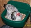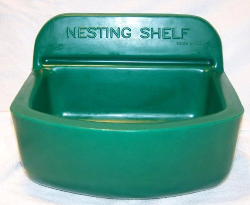 The HEN NESTING SHELF that is 14.00" x 16 5/8" x 11.00", weights four pounds and is green in color. The shelf has a polished surface for ease of maintenance and a dust drain to keep the fines out of the nest. The nesting shelf has a mounting strip along the back surface to accommodate any size or wall configuration.