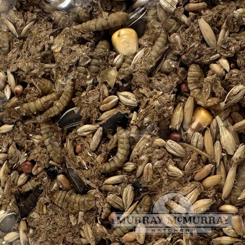 Made from 100% organic dried soldier fly larvae and organic scratch grains — locally sourced and produced in Central Iowa for McMurray Hatchery.