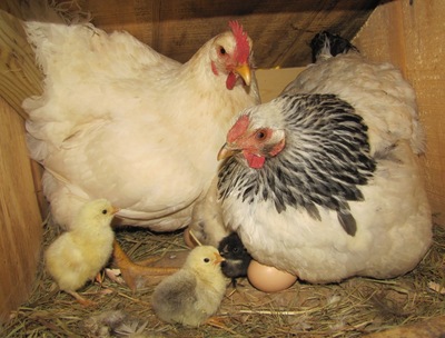 These two girls laid, set on and hatched out their eggs side by side, then continued to raise them as a team for three weeks. Amazing! Best hens I've ever had! And, with such different, yet complimentary parenting skills. Both were very nurturing, but the one on the left had a bit more "disciplinarian" in her. So fun to watch!