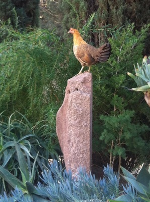 Goldy likes to get above the fray when out free ranging. She's on a sculpture I made and placed in the garden