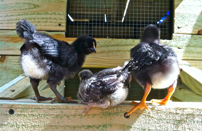 Summer Chicken Butts! 2-week old Black Star, Silver Polish and Cuckoo Maran checking out the progress on their new chicken coop.
