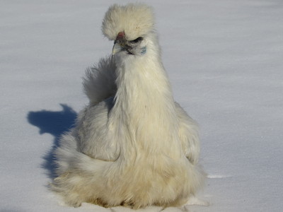 Here is my white silkie pullet out in the snow.