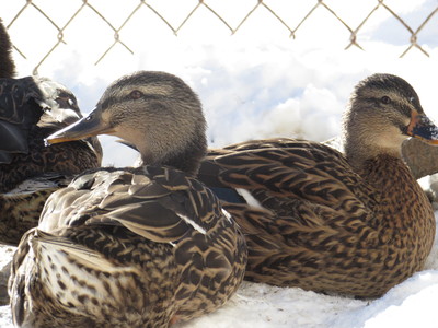 Mallard hens setting in the snow.