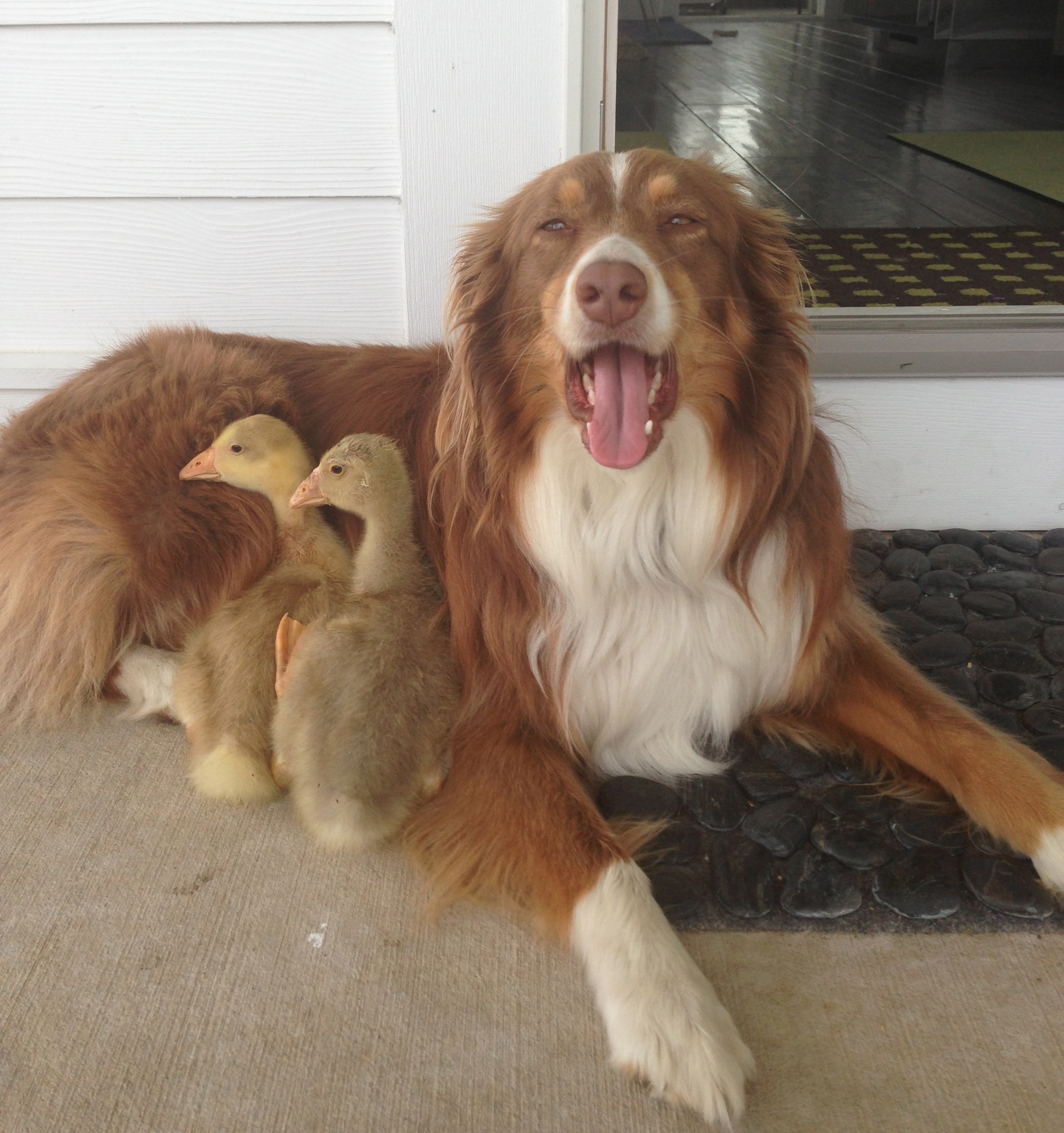 Our dog, Lily, mothers all of our feathered babies on our farm.