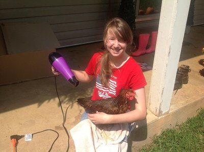 Madison Whitman getting one of her chickens ready for the Hartwood Days show in Hartwood, VA. This particular hen took best in breed and best in class.