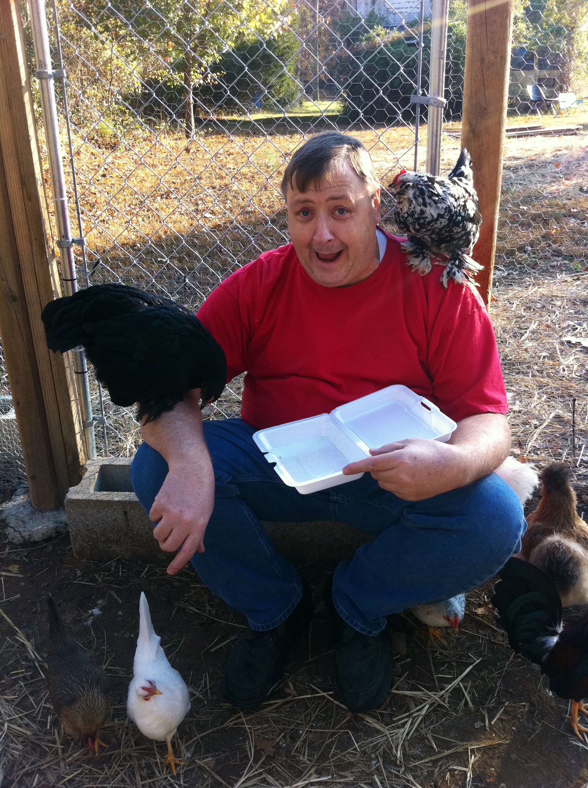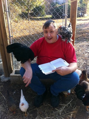 This is a photo of my dad feeding the chickens some scraps. They just wanted more.