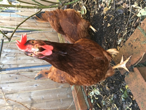 Peeping Beauty, my Rhode Island Red with her sister Henny Penny in the background, another RIR