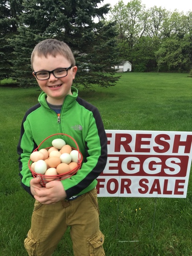 Son Nicholas with eggs from Speckled Sussex and Americaunas.