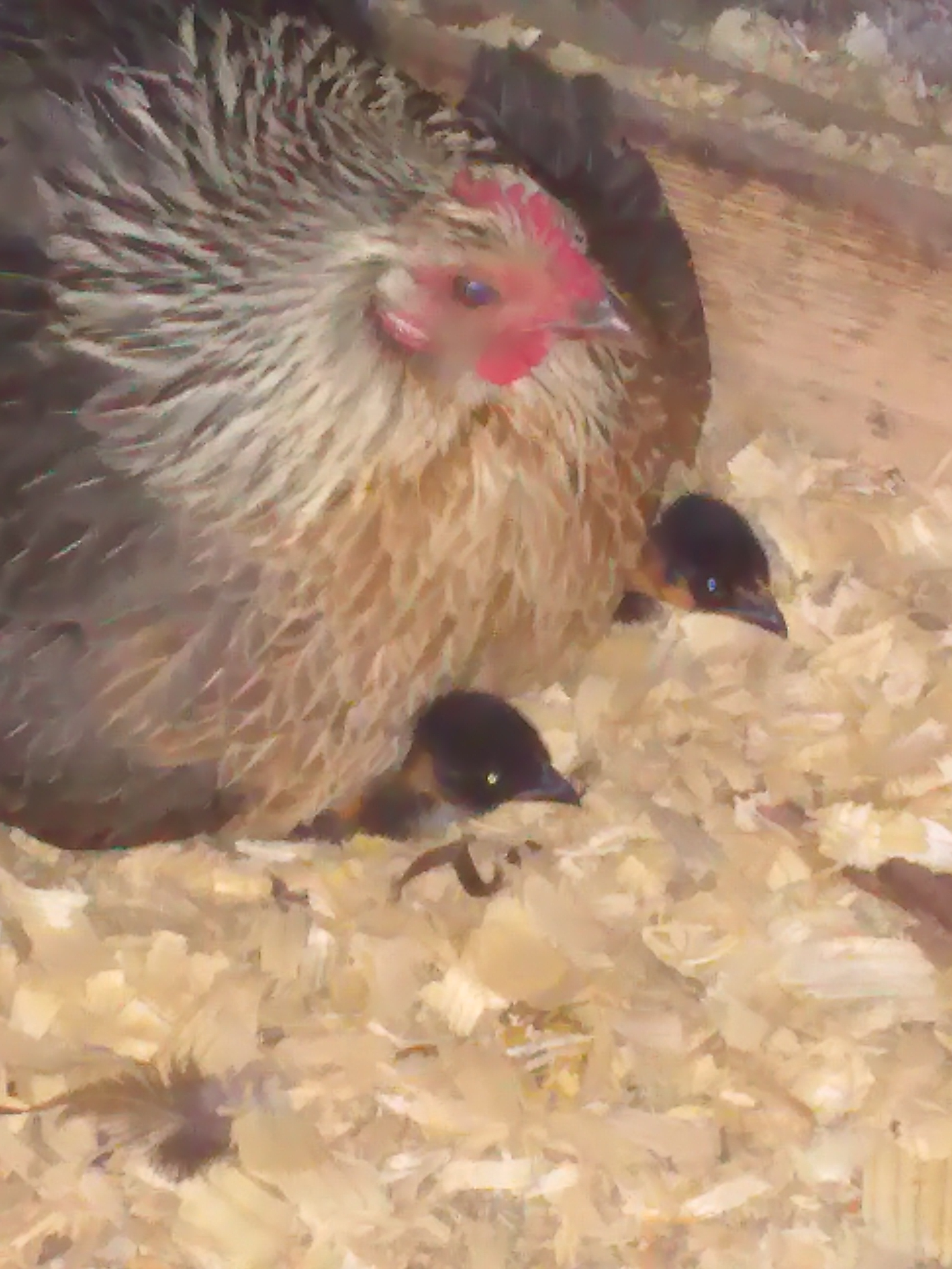 Phoenix hen with mixed breed chicks