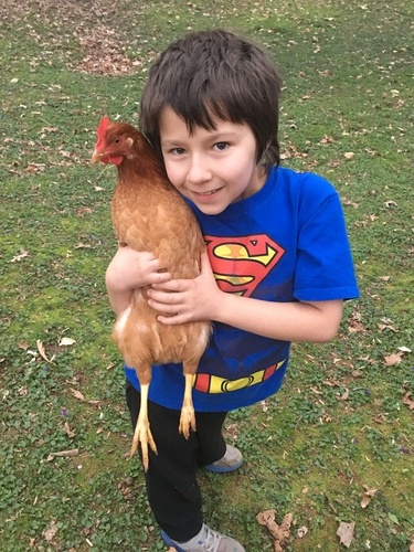 Kaleb enjoying the early spring weather with his ISA Brown hen