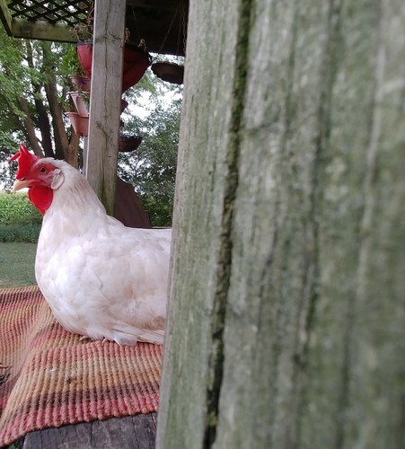 This is Ellen, my White LegHorn. Here she sits on the front porch watching the world go by. The only thing she is missing is a glass of sweet tea.