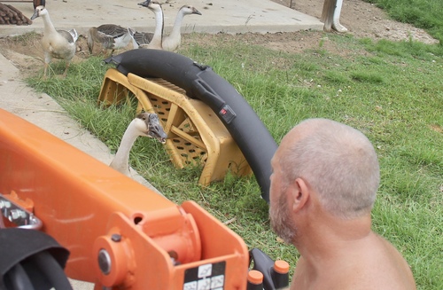 Our African Gray Goose supervising my husband while he changes the oil on our tractor.