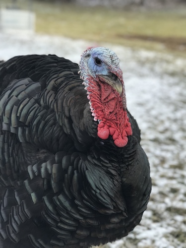 This is Mr. Gobbles our 8 month old broad breasted bronze turkey in his first snow!