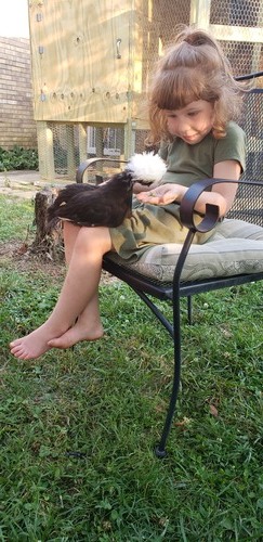 Little Camilla grew peas in the garden and was sharing them with our crested polish, Sheena, the punk rock chicken.