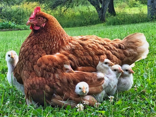Louise (ISA-Brown) and her 2 week old chicks (crossed with Salmon Faverolle) enjoying a beautiful August evening.