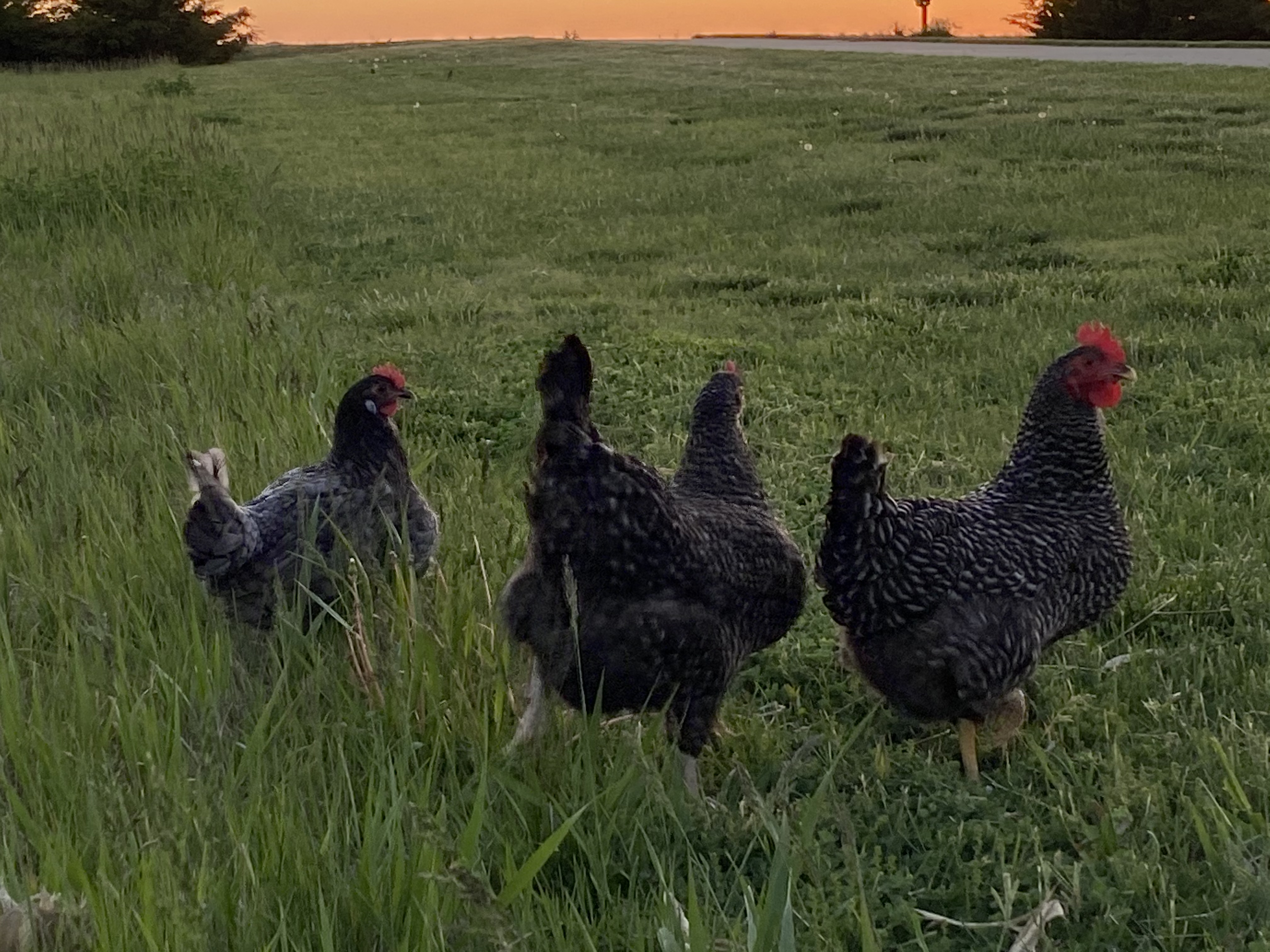 Free-range sunset Cuckoo Maran, Blue Andalusian, Barred Rock