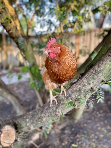 This is my Red Star Chicken. Her name is Captain Marvel. She’s beating the heat in the shade of the tree.