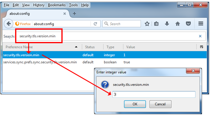 Changing the setting will force Firefox to use TLS 1.2 or better