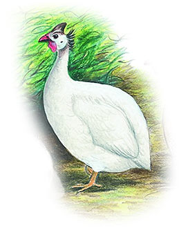 These are also known as albino guineas because they are nearly all white with just a speck of black sometimes found on the neck. The skin on these birds is also slightly lighter than the other varieties.